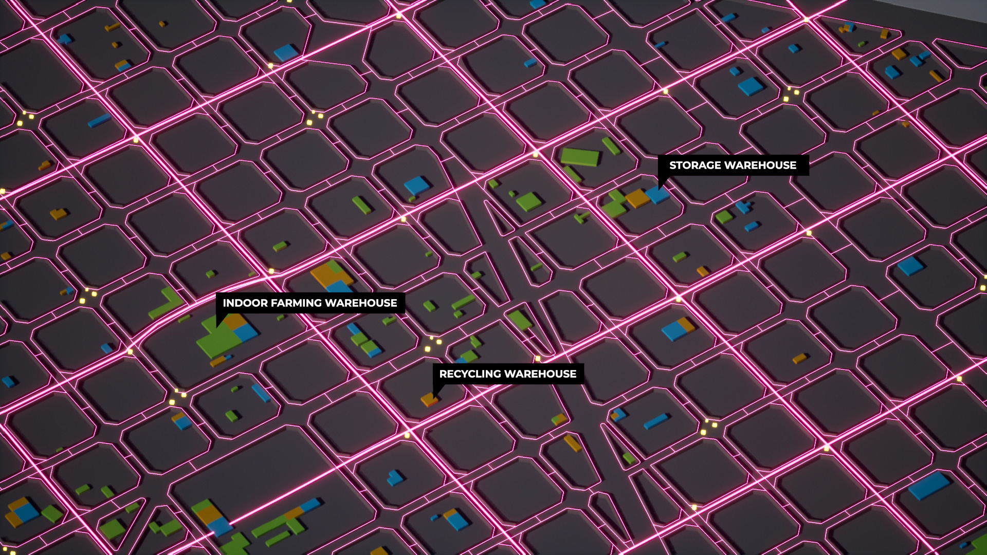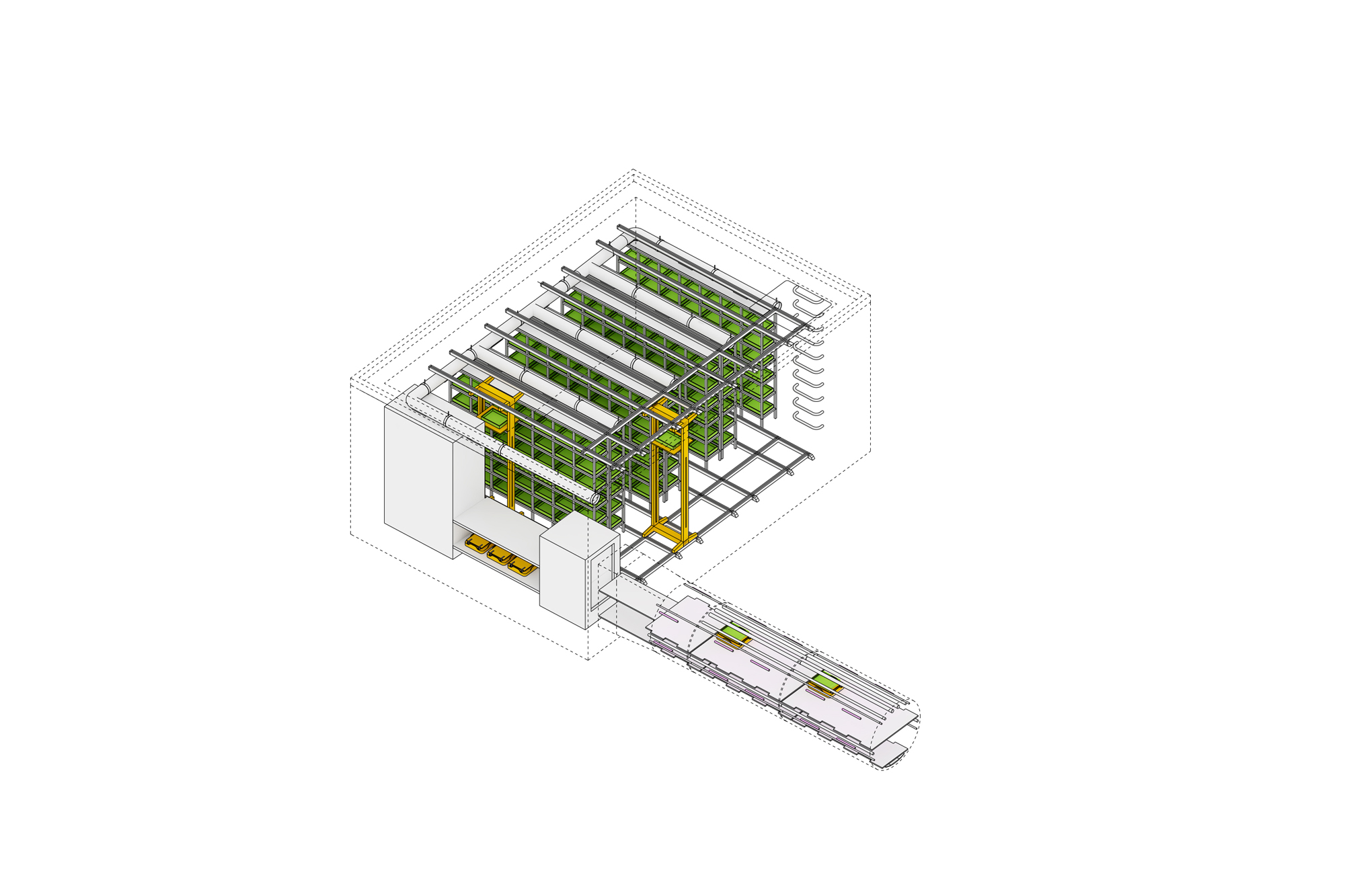 By moving most carrier traffic below ground, these elements alleviate congestion on the streets, allowing pedestrians to enjoy more open urban spaces. The advanced stage of the LML system includes vertical shafts that reach interior spaces such as homes, offices, and retail locations, as well as dedicated warehouses that LML users can personally utilize as storage rooms.